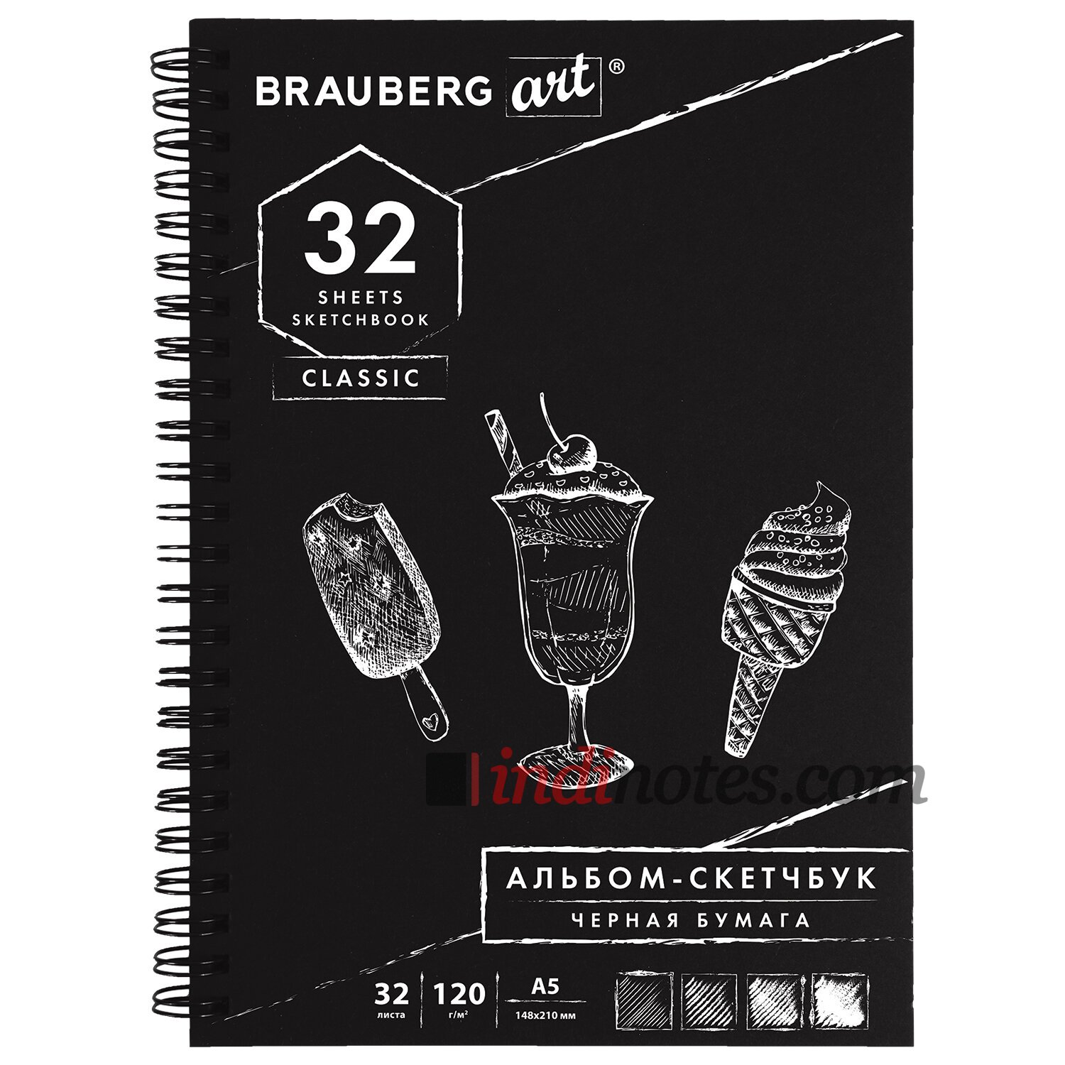 Привлекательная обложка выполнена из импортного мелованного картона. В блокноте 32 листа бумаги черного цвета плотностью 120 г/м2, т.е. 32 возможности воплотить свою задумку! Листы удобно скреплены спиралью - это позволяет переворачивать их на 180 градусов. Задняя подложка жесткая, что позволит делать зарисовки и наброски "на весу". Удобный формат размером 148х210 мм.
