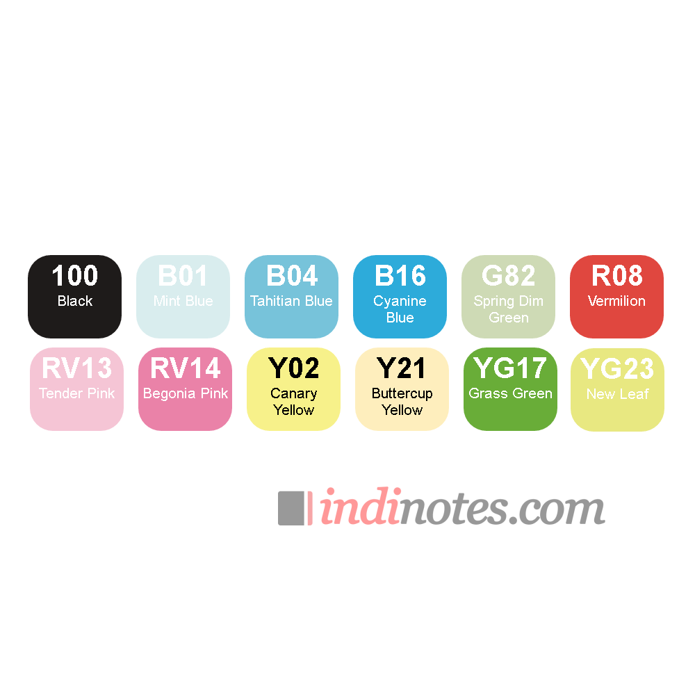 Цвета в наборе вы можете увидеть слева на фотографии товара в виде таблицы «выкраски»: Y02, Y21, R08, RV13, RV14, B01, B16, B04, G82, YG23, YG17, 100.