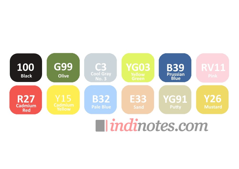 Цвета в наборе вы можете увидеть слева на фотографии товара в виде таблицы «выкраски»: C3, YG03, B39, RV11, R27, Y15, G99, B32, E33, YG91, Y26, 100.
