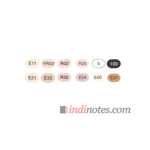 Цвета в наборе вы можете увидеть слева на фотографии товара в виде таблицы «выкраски»: YR02, R02, R20, R32, E00, E04, E11, E21, E35, E37, 0, 100.
