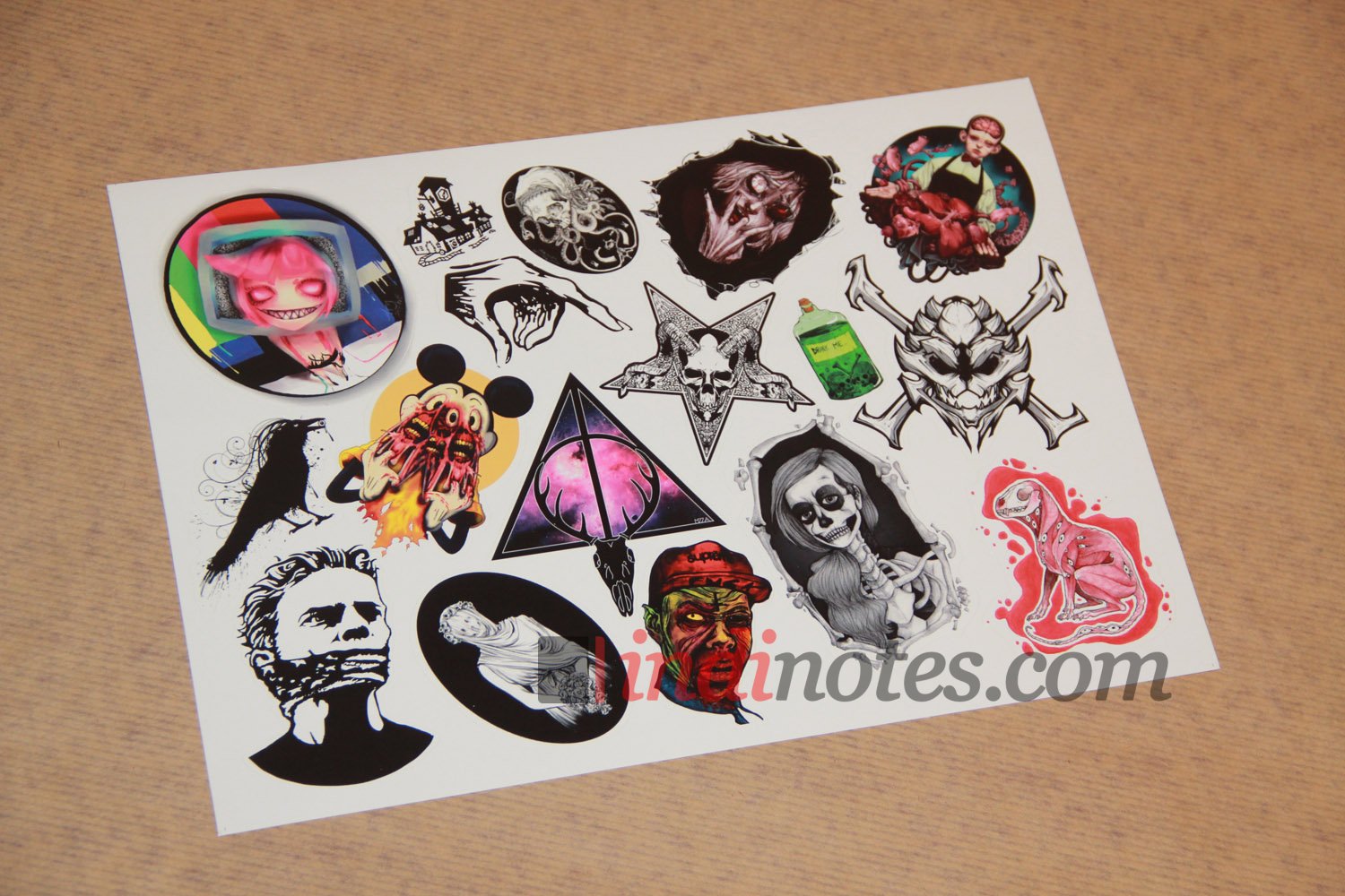 Лист виниловых наклеек (стикеров) с различными изображениями.