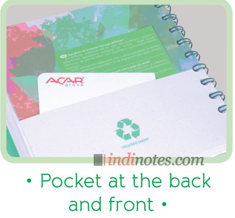 Особенности модели: специальный карман для хранения записей, полускрытая спираль зеленого цвета, тетрадь на резинке, ручка