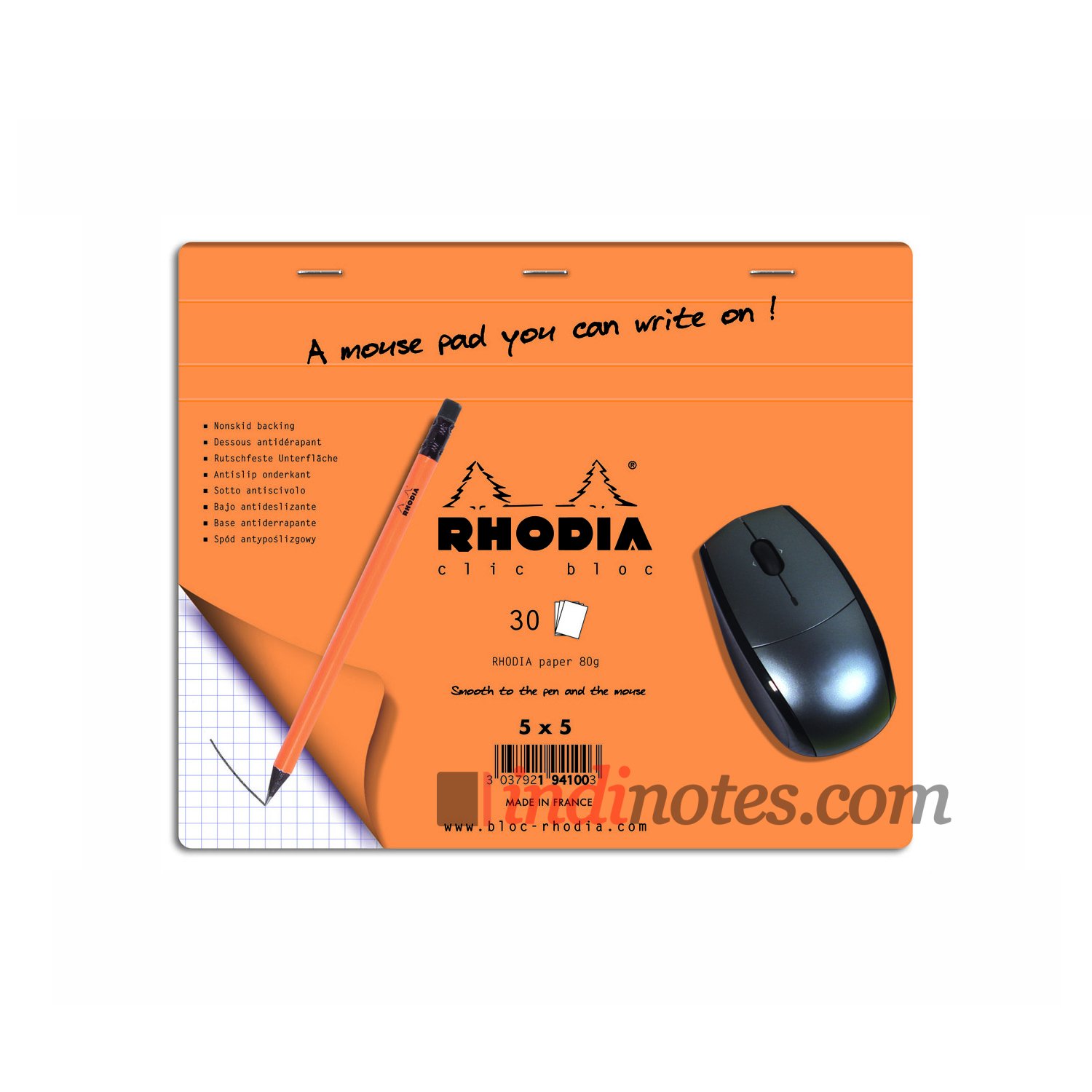 Внутри — 30 листов в клетку из знаменитой бумаги Rhodia плотностью 80 г/кв.м. Бумага одинаково гладкая и для карандаша и для вашей компьютерной мышки.