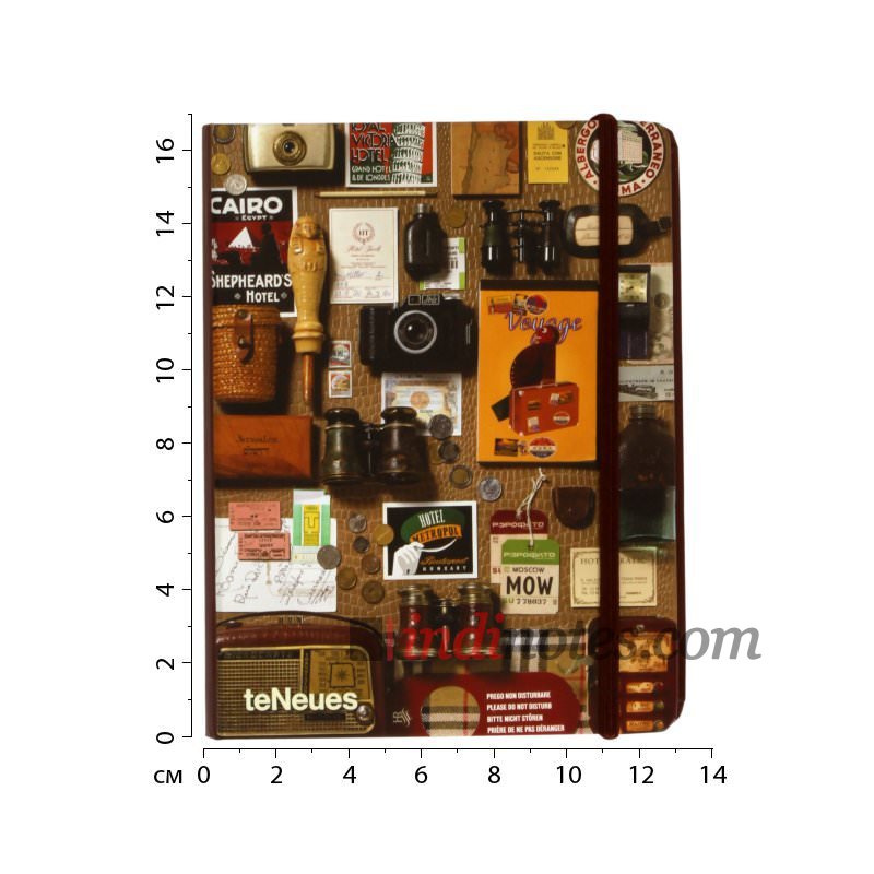 Под фиксирующей резинкой и красивой обложкой с ретро-принтом в стиле путешествий вы найдете блокнот на 100 страниц в светлую линейку из великолепной бумаги teNeues, 6 надежных карманов для всех ваших билетов, карт, чеков, так необходимых в путешествии, и петельку для ручки или карандаша, которая удобно прячется внутри корешка этого органайзера.